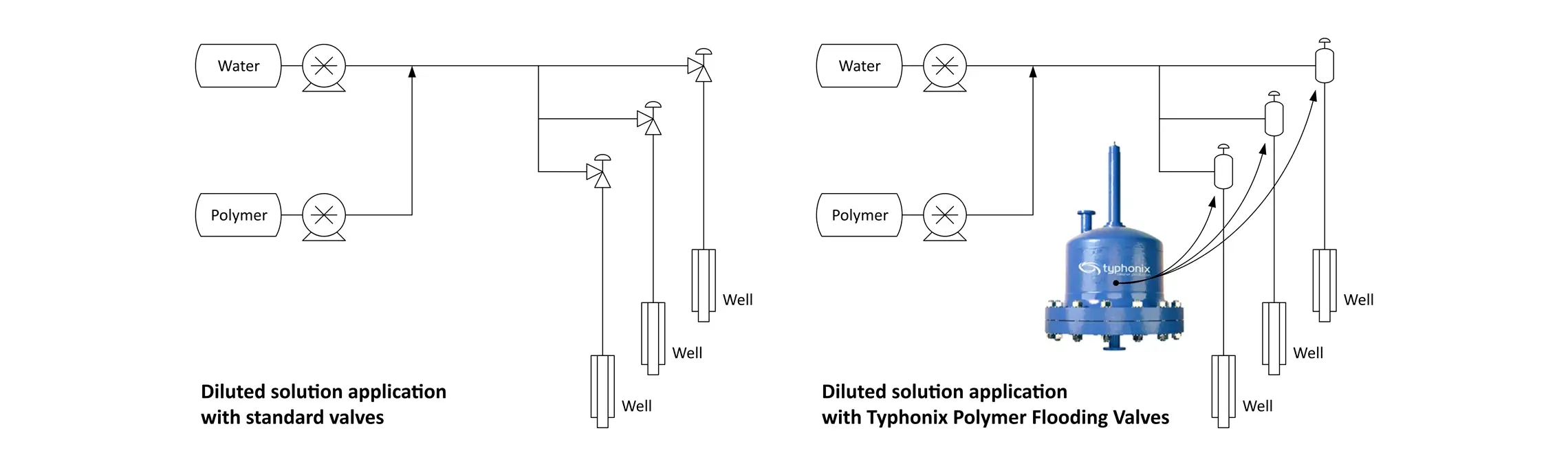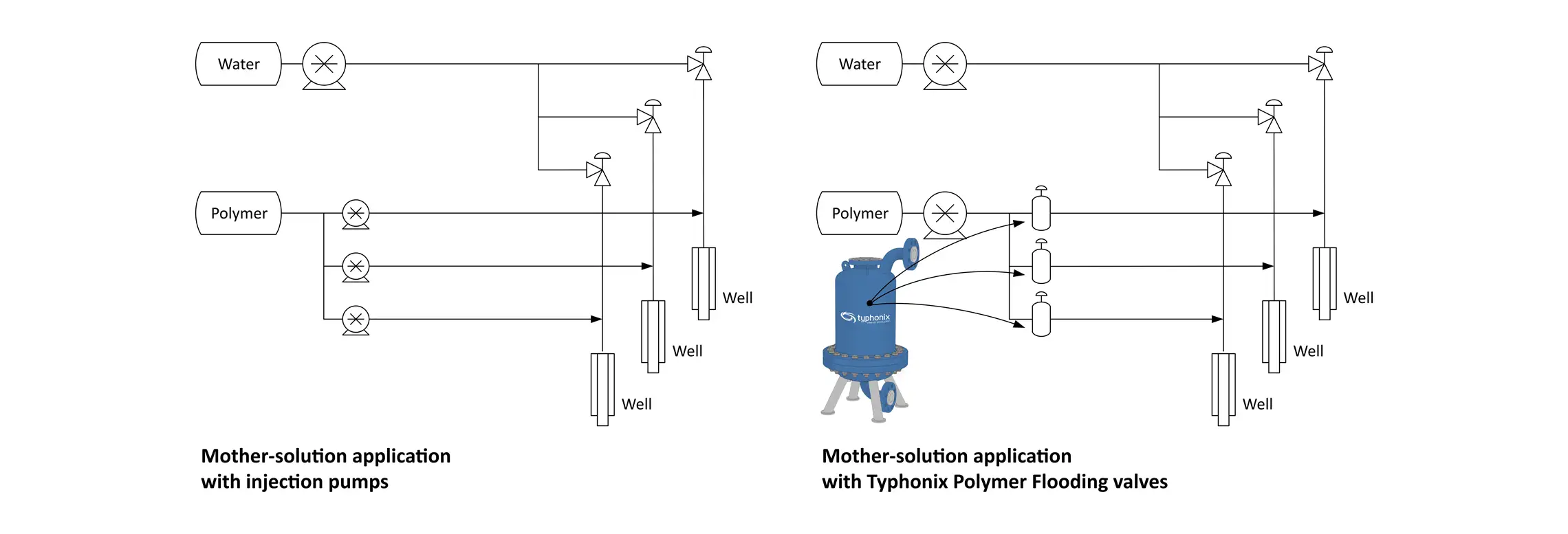 Generally, when using Typhonix Polymer Flooding Valve in the mother solution application, the one pump-per-well injection scheme is replaced with a larger central pumping station plus one low shear valve per well to control the polymer injection rate. In this case, the low shear valve has the same low shear performance as the positive displacement pumps. However, compared to the one-pump per-well scheme, the central pumping station and low share valves will result in significantly lower maintenance costs and an overall lower energy consumption.
