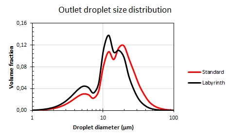 Figure 4: Droplet size distribution for valves with a single stage cage and with a labyrinth type cage