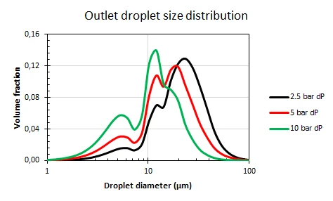 The energy dissipation rate is not homogeneously distributed in a valve. There will always be pockets of high intensity turbulence and high energy dissipation rates, and pockets with lower intensity turbulence. Not all droplets will pass through the same areas, and will therefore not experience the same shearing effect. This can cause what is known as bimodal droplet size distributions. Bimodal distributions show two or more tops in the droplet size distribution, and generally has a higher concentration of small droplets, i.e., the tail end of the distribution. This phenomenon becomes more prominent at increasing differential pressure, as shown in Figure 3. This graph shows the outlet droplet size distributions for a conventional valve for different pressure drops, with constant inlet droplet size and fluid properties. The results show a distinct increase in the tail end of the droplet size distribution, containing the smallest droplets.