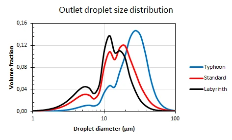 Figure 5: Outlet droplet size comparison between a standard (single stage) valve trim, a labyrinth valve trim and a Typhoon valve trim.