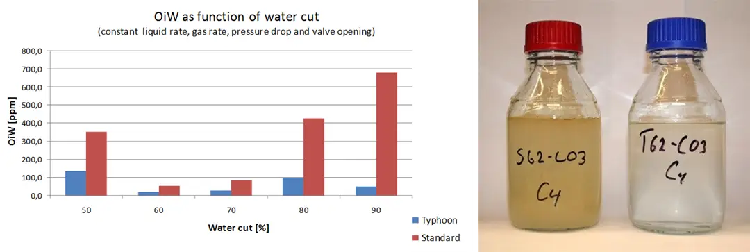 Figure 6: Separator water outlet OiW concentration as a function of WC and valve type (left), water samples from the same test conditions for the standard and Typhoon Valve System (right). (Click to enlarge figure)