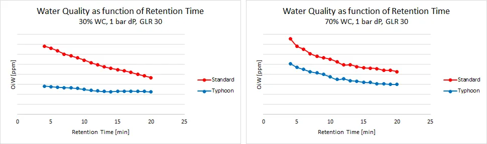 Figure 7: Separator water outlet quality as a function of the retention time for a standard valve and the Typhoon Valve System. (Click to enlarge figure)