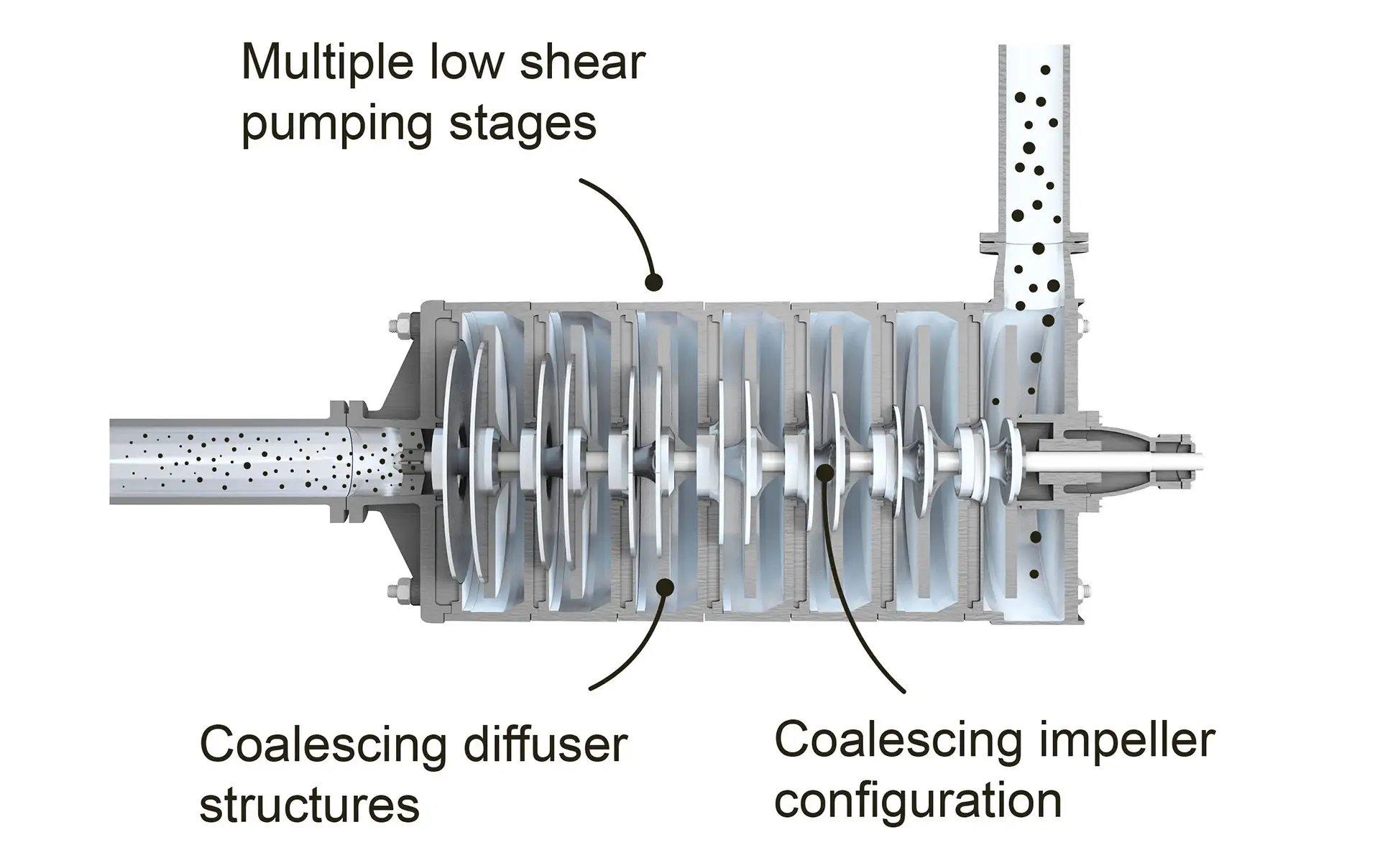 The Low Shear pump is a multistage centrifugal pump with high hydraulic efficiency. The layout and configuration of the individual stages are custom designed to control shear forces and minimize oil droplet breaking.