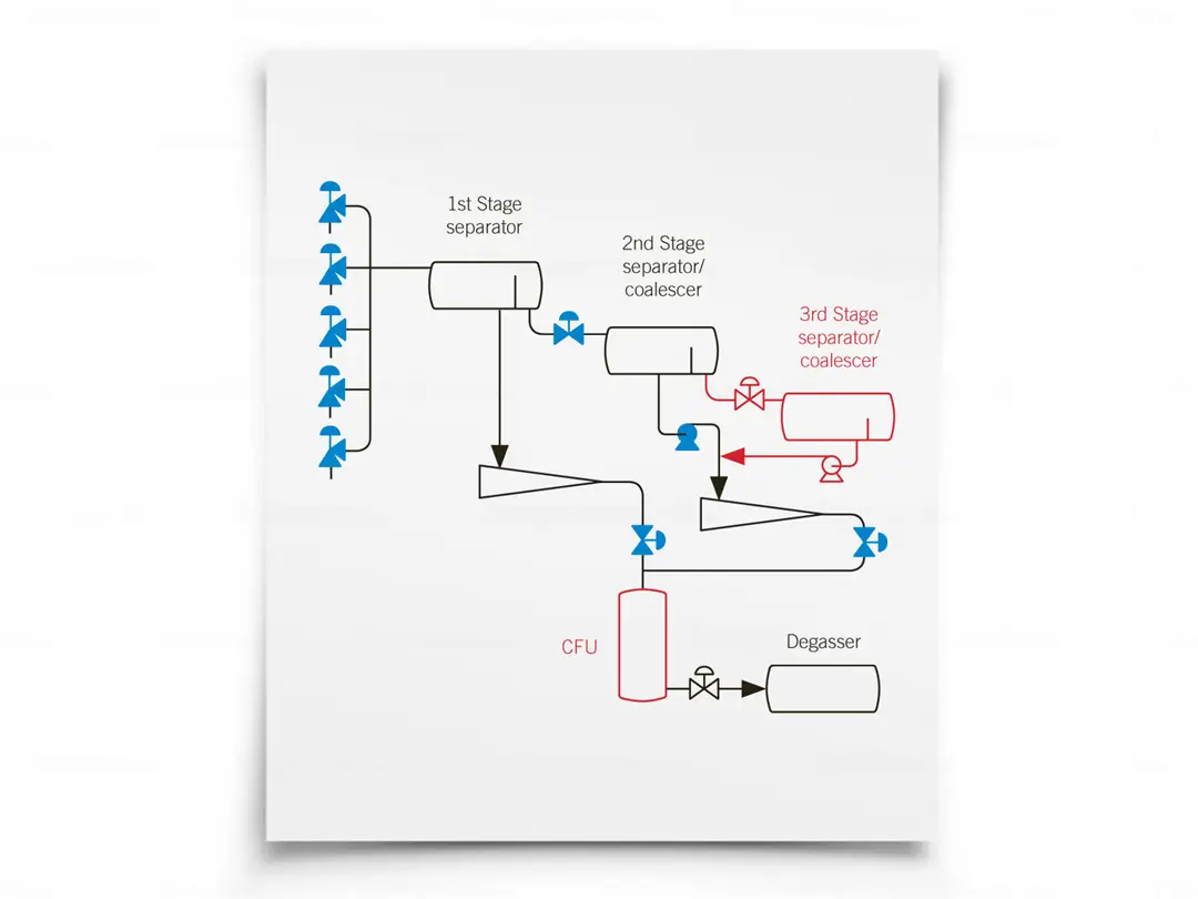 Shear forces in oil and gas production cause droplet break-up and emulsification. Upstream the chokes, oil droplets exist in the millimeter size range, whereas downstream the chokes, the droplets are in the micrometer size range. Process plants with several treatment stages are required to handle the small droplets and tight emulsions, resulting high weight and large footprint.